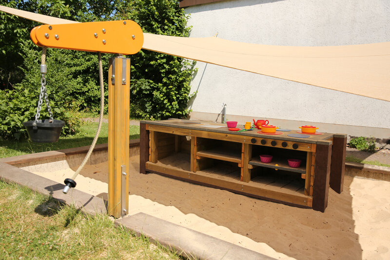Das große Außengelände der KiTa ist ansprechend gestaltet und bietet vielfältige Spiel-, Kletter- und Rückzugsmöglichkeiten. Dieses steht allen Kindern ganztätig zur Verfügung und ist durch einen direkten Ausgang aus allen Gruppen gut einsehbar.